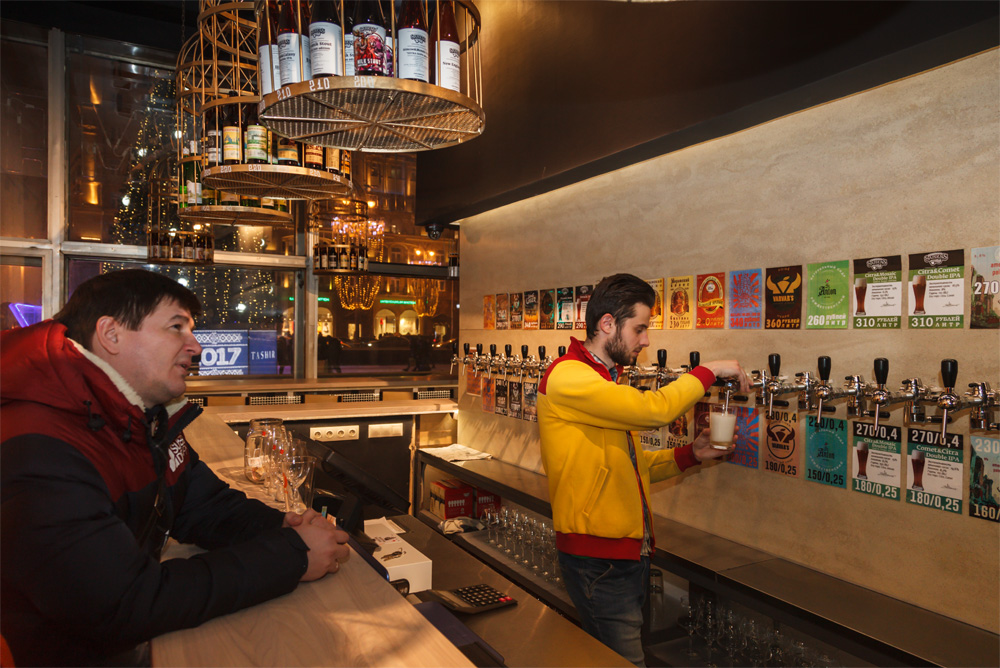 Из "Грейнрус", отправились в центр и состоялся импровизированный "забег по барам". Первым был - новый бар "ГлавПивМаг - 3". Он расположен на Тверской 18, вход с Большого Путинковского переулка. Если "ГлавПивМаг - 1" - это магазин разливного пива, "ГлавПивМаг - 2" - магазин и бар, то "ГлавПивМаг - 3" - просто бар (хотя можно взять пиво и на розлив, так же есть и бутылочное). Оформлен бар довольно оригинально, с птичьими клетками под потолком, в которых заключены бутылки с пивом. Помещение совсем небольшое, имеется большая барная стойка, также можно посидеть за длинным стойкой с видом на Тверскую. Место, конечно, "козырное", но и цены повыше средних. Из пива, выбрал "The Green God" от "Velka Morava". Отличный полный ИПА, с довольно ярким ароматом и вкусом, хорошо сбалансированным.