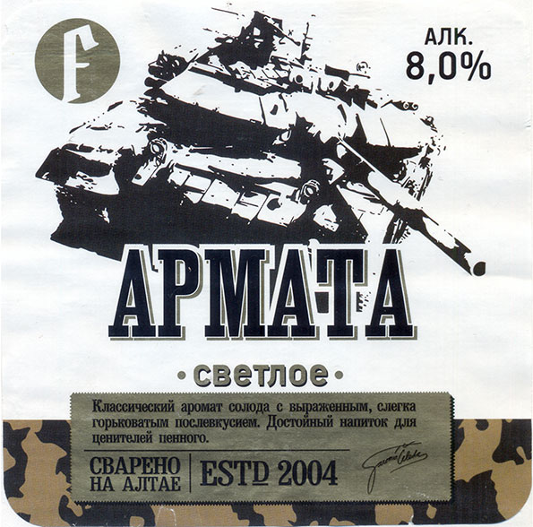 Барнаул, "Форштатская пивоварня", "Армата" - на этикетке изображен танк, но точно не Армата (скорее Т-80). Обычно у региональных и малых пивзаводов крепкие сорта получаются приличные, но здесь прямо аналог "Охоты" вышел. Вкус солодовый, чуть винный, алкоголь проглядывает явно...