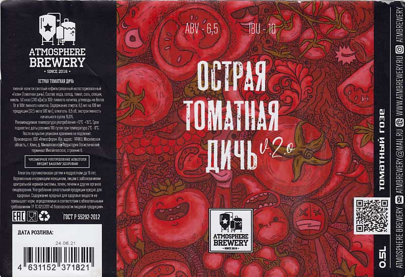 Контрактники из Atmosphere brewery построили свой завод под Клином и теперь варят на собственных мощностях. Уже пробовал их пиво на фестивале в Клину, вот еще прикупил свой любимый томатный гозе - "Острая томатная дичь" (v. 2.0). Действительно - весьма остро, во вкусе - традиционные томаты, соусы, специи. Плотно, мощно.