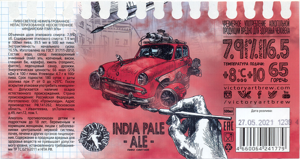 После того, как пиво от Victory Art Brew появилась в сетях и получило определенную известность, начались сложности с названиями сортов - из-за родственников Кожедуба сорт "Иван Кожедуб" превратился просто в "Иван", а из-за федерации хоккея - "Красная машина" в просто "Машину". На данной этикетке даже слово "Машина" не употребляется, только "Индийский пэйл эль", но по картинке вполне понятно, что пьется сорт первого сваренного коммерческого ИПА в России. Вкус, классический для ИПА - плотное тело с карамельными тонами, довольно яркий и горький хмель дает цитрусовые и прочие тона экзотических фруктов.