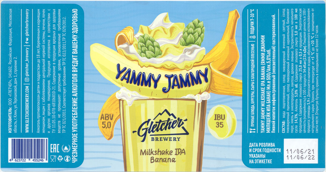 Клинский "Глетчер", "Ямми Джамми, милкшейк ИПА банан" - ну прямо банановый сок! Хмель во вкусе почти не ощущается, хотя горечь указана как 35 IBU (но он тут и не сильно нужен).